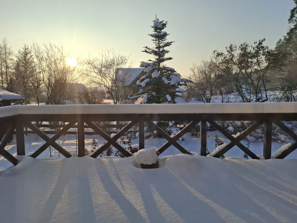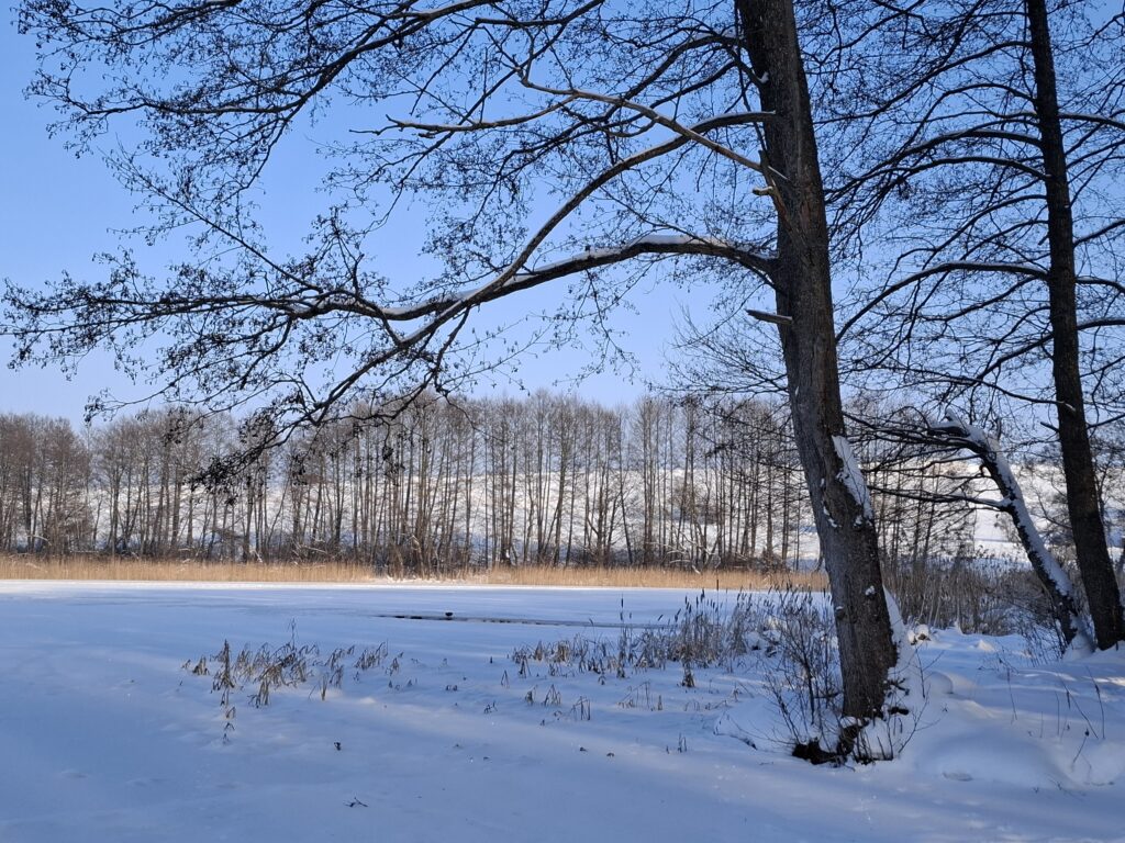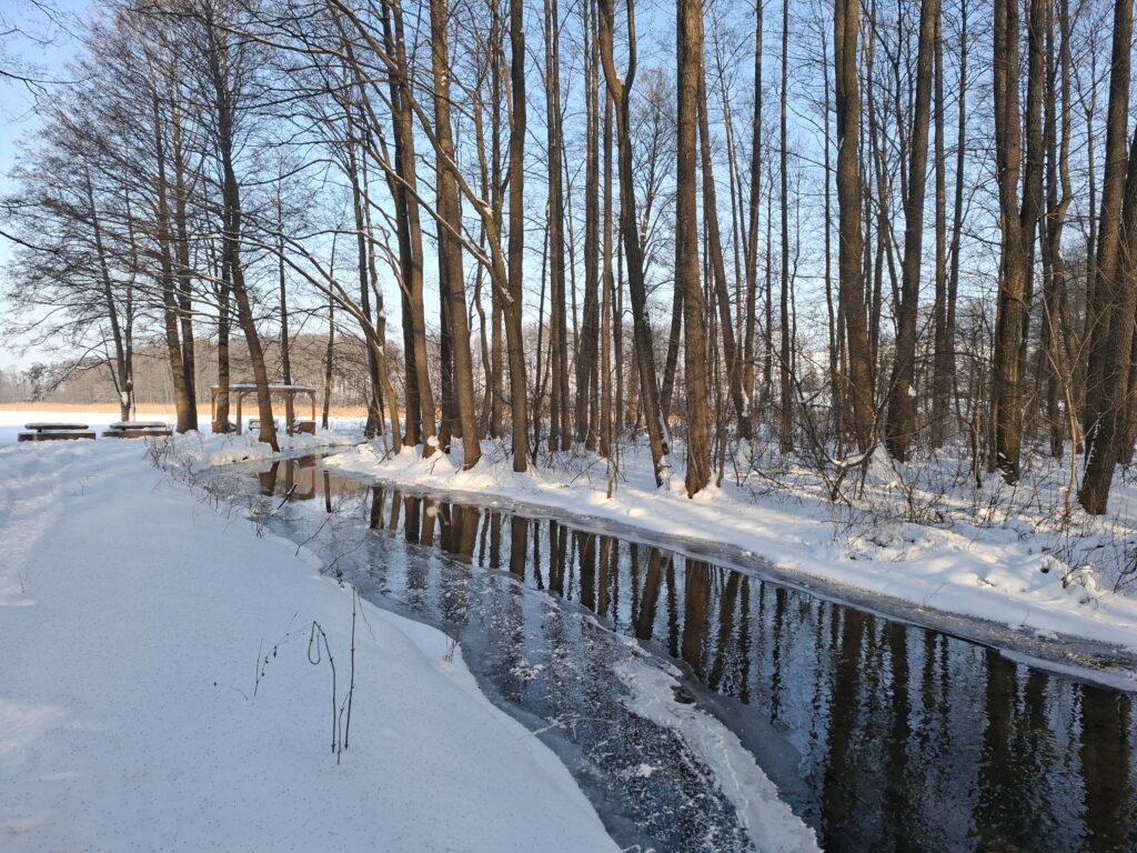 I jak tu się nie zachwycać? Tyle śniegu, mrozu i słońca dawno na Mazurach nie było! Chociaż ręce i nosy marzną, to widok zaśnieżonych łąk, lasów, zamarzniętych jezior, oszronionych traw i krzaków wynagradza wszystkie niedogodności. Tylko nasza rzeczka wpływająca do jeziora nic sobie z tej mroźnej zimy nie robi i nadal płynie. Niezamarznięta!